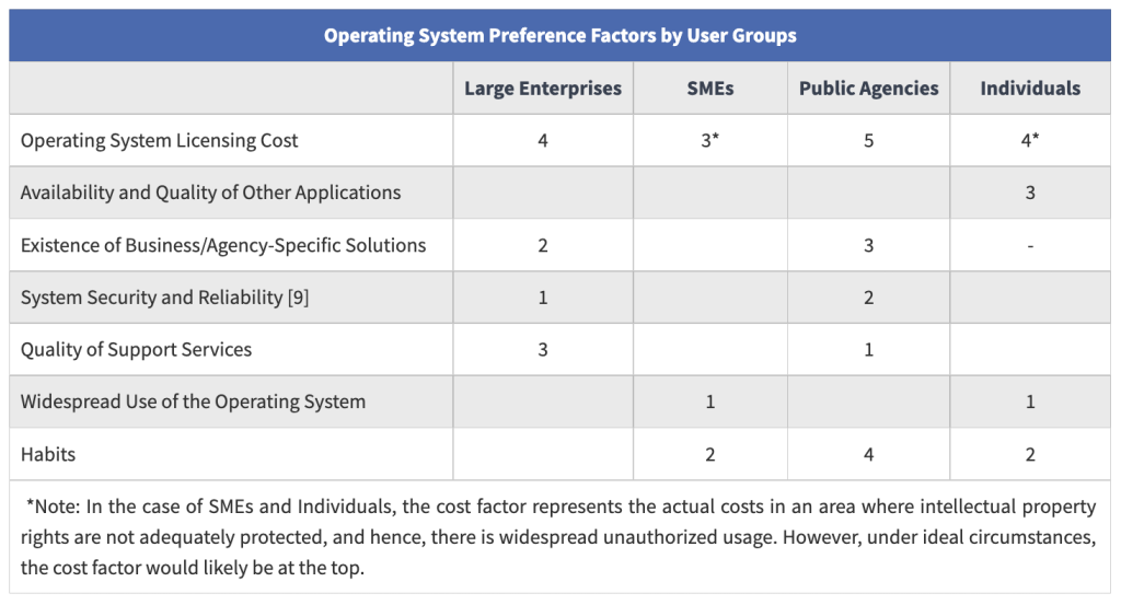 2. SMEs (Small and Medium-sized Enterprises): These businesses employ a relatively small number of people who don’t heavily rely on IT systems except for basic office and accounting tasks. For SMEs, cost is the most critical factor. They may not allocate many resources to software, sometimes resorting to using software illegally, and often rely on community knowledge for support. Unfortunately, using common, and sometimes pirated, software may be seen as the most cost-effective solution. Therefore, ubiquity rather than licensing costs is a crucial preference factor for SMEs.