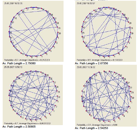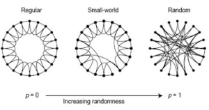 This process introduces non-lattice edges, likely to connect distant nodes in the original lattice. By varying “p”, we can interpolate between a regular lattice (p = 0) and a random network (p = 1):